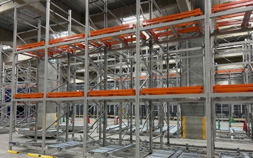 各段ごとに異なる商品を保管し、段単位で後入れ先出しの運用方法を実現。最下段にフローラックを設け、先入れ先出し運用にも対応しています。